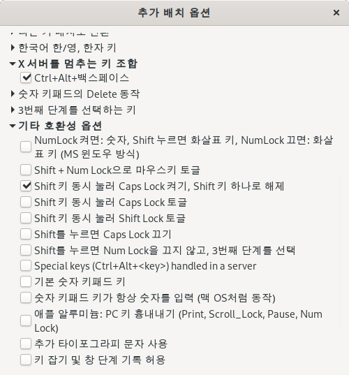 참고로 위에 X서버를 멈추는 키 조합을 켜두면 갑자기 X윈도우가 먹통이 되는 경우 해당 키를 눌러서 X에서 빠져나올 수 있다. 개발용 기능을 많이 사용하여 불안정한 프로그램을 많이 쓴다면 유용한 기능이다.