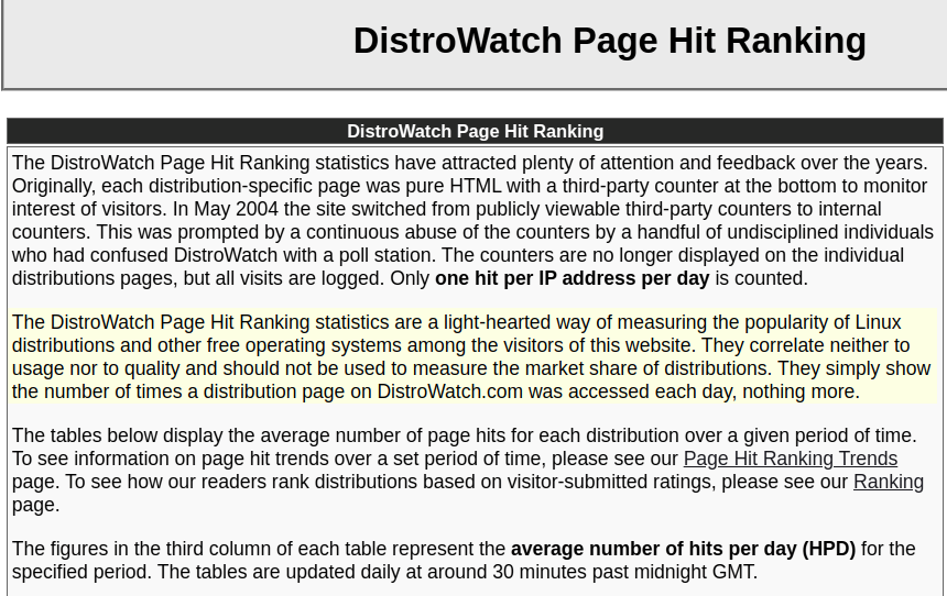 중간에 색칠된 부분을 보면 이 웹사이트(디스트로왓치)의 방문자들에 대한 순위 정보라고 쓰여있고, 리눅스 사용이나 품질에 대해 상관도 없고 리눅스 배포판의 점유율 측정에 사용하지 말라고 되어있다. 마지막 문단에도 디스트로왓치에 액세스 한 횟수일 뿐 아무것도 아니라고 쓰여있다. 따라서 그냥 아무 의미 없는 정보다. (사실 이런 의미 없는 정보를 왜 사이트에 떡하니 올려놔서 혼동을 일으키는지 모르겠다. 그냥 저런 정보는 없느니만 못하다.)