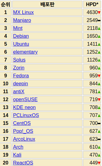 예를 들어 오늘자로 distrowatch.com의 순위는 다음과 같다.