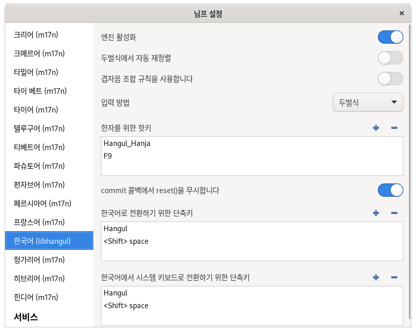 아래로 조금 내려가서 한국어(libhangul)에서 다음과 같이 설정한다.