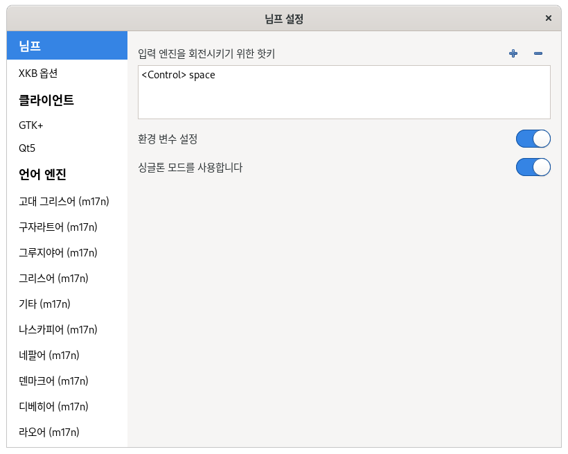 root 유저는 로그아웃을 하고 원래 사용하던 일반 유저로 nimf-settings를 실행한다. 실행 후 아래 그림처럼 설정을 한다.