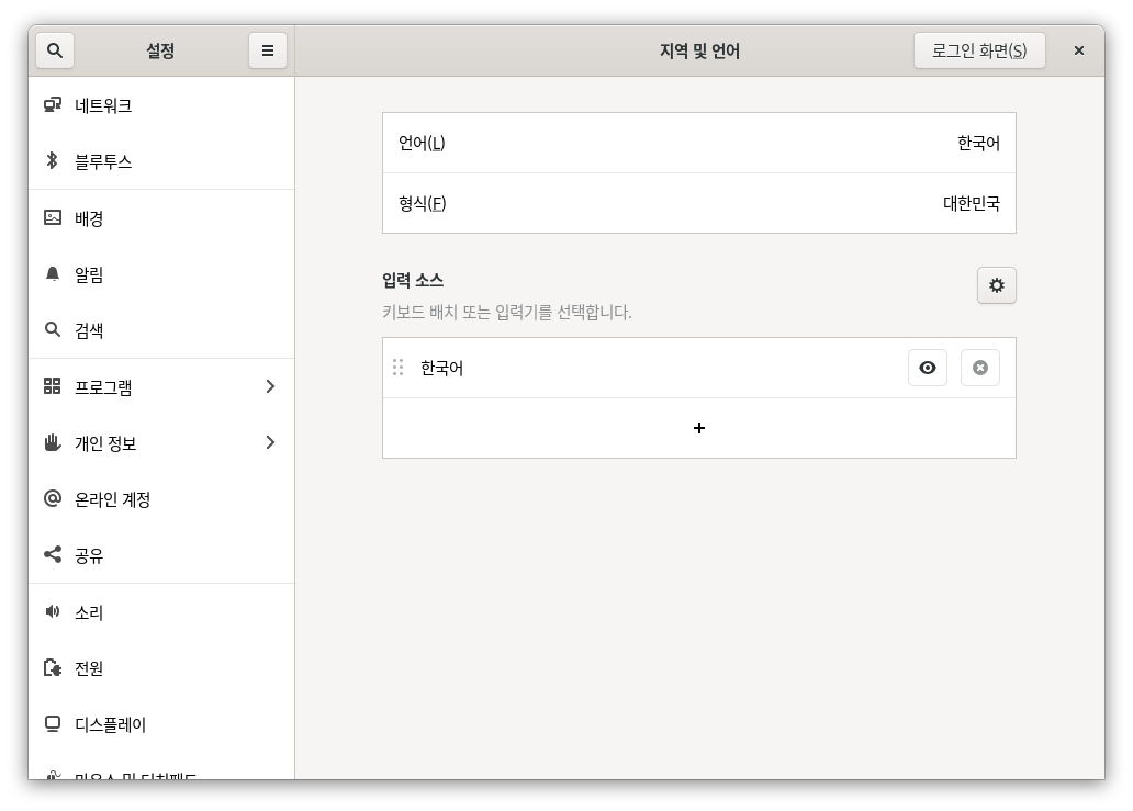 먼저 su - 로 root 유저로 변경하고, 설정의 "지역 및 언어"에서 기존 ibus의 "한국어(Hangul)"을 "한국어"로 변경해둔다.
