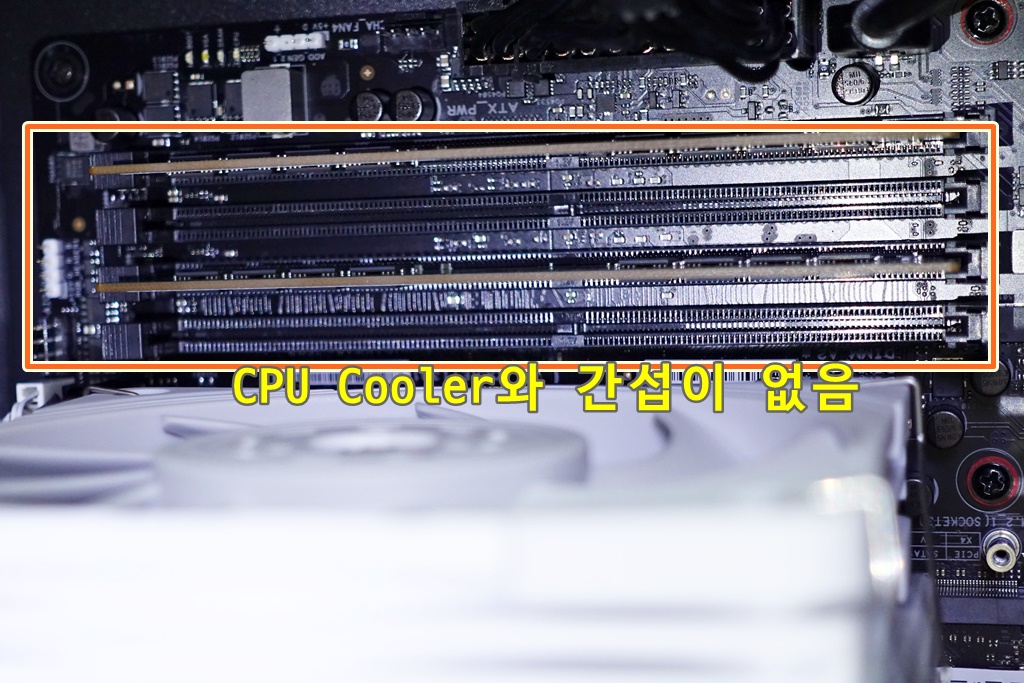 램슬롯과 다른 부분의 간섭은 없다. 어떤 메인보드는 CPU팬이 첫번째 램 슬롯에 닿는 경우도 있는데, ProArt B550 메인보드는 그런 증상은 없다. 참고로 CPU쿨러는 팔라딘인데, 팬만 써멀라이트 TL-B12로 교체했다.
