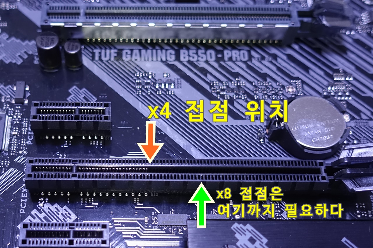 또한 일반 PC의 경우 그래픽 카드를 2번째 x16 슬롯에 설치하는 경우도 있는데, 이는 요즘 그래픽 카드가 워낙 고성능이다보니 발열도 심각해서 CPU와 띄워두는 것이 냉각에 좋다는 견해도 있기 때문이다. 요즘 나온 nvidia 3천번대 고급형 그래픽 카드의 성능을 온전히 사용하려면 약 9~10Gbps 정도의 대역폭을 필요로 하는데, PCIe 4.0 x8 정도가 15.75GB/s (= 약 128Gbps)이므로 최소 x8 슬롯 정도가 필요하다. 하지만 앞서 말한대로 2번째 x16슬롯을 B550으로부터 나온 PCIe 3.0 x4배속을 사용하면 성능을 다 쓰지 못한다. 메인보드의 2번째 x16 슬롯이 x4인지 x8인지는 메인보드 설명서나 제품 웹페이지의 사양을 봐도 되지만, 메인보드 2번째 x16슬롯의 접점을 확인해도 된다. 아래는 다른 제품인 ASUS B550-Pro 메인보드의 슬롯 확대 사진인데, 전체 슬롯의 약 1/4정도만 메탈 접점이 존재하고 있음을 알 수 있다.(이런 경우는 매뉴얼에 두번째 슬롯은 크기는 x16이지만 x4까지만 지원한다고 되어있다)