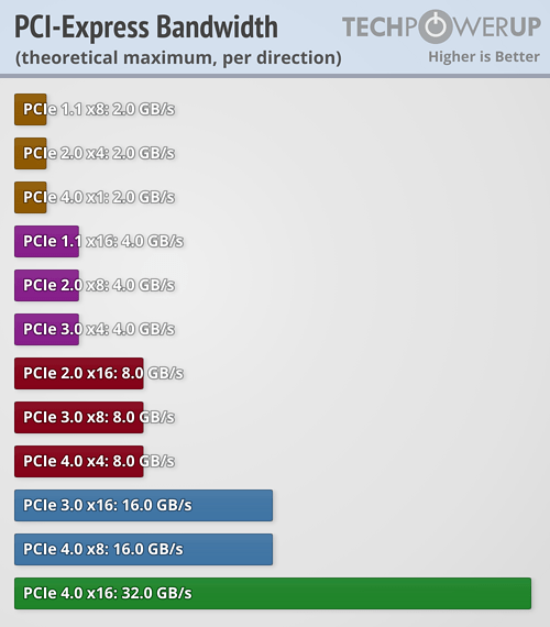 PCIe는 버전이 올라갈때마다 대역폭이 2배로 늘어난다. 따라서 PCIe 2.0 x16 == 3.0 x8 == 4.0 x4 와 같다. 그리고 현존하는 그래픽 카드는 최대 약 10GB/s 정도를 필요로 하므로 PCIe 3.0 x16이나 4.0 x8 정도면 커버가 가능하다. 실제로 pugetsystems.com에서 William George라는 분이 테스트한 결과로는 RTX 3080 사용시 4.0 x8 정도면 차이가 없었다. [1]