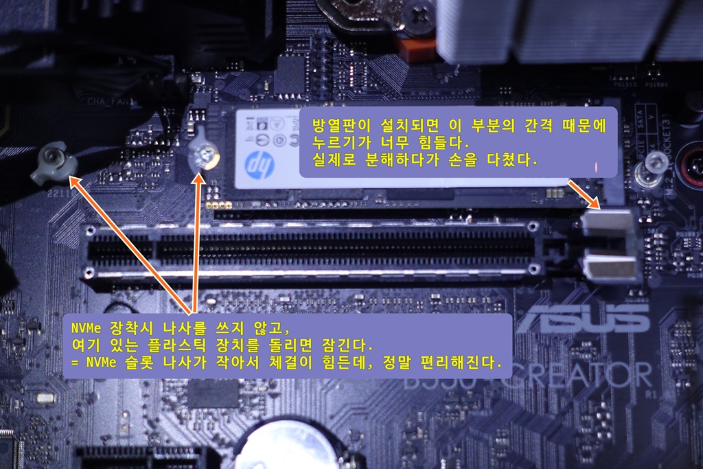 또한 NVMe가 사용되는 M.2 슬롯에 나사가 없다는 장점이 있다. NVMe SSD를 꼽고 설치된 플라스틱 기구를 돌리면 체결이 끝난다. 드라이버 없이 NVMe 설치를 할 수 있다는 점이 참 좋았다. 물론 기본으로 제공되는 NVMe 방열판까지 설치하려면 드라이버는 꼭 있어야 한다.