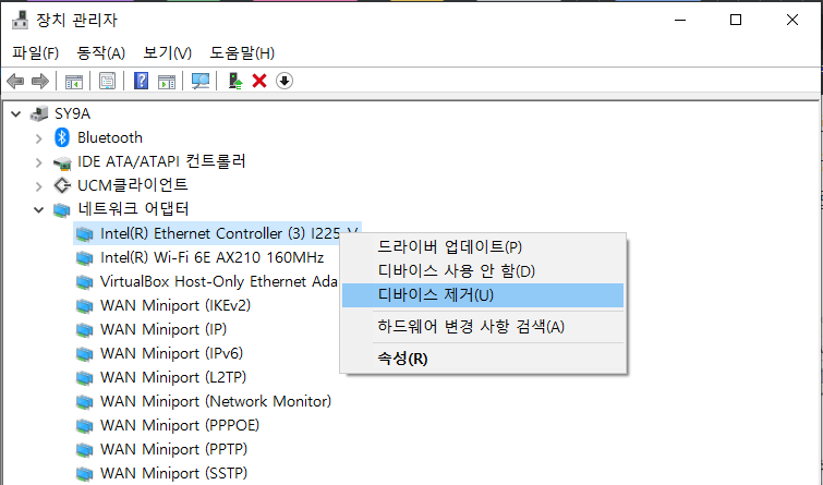 드라이버 및 관련 소프트웨어 삭제를 위해 장치관리자를 실행해야 한다. 장치관리자를 띄우는 방법으로는 "윈도우키 + X"를 누르면 나타나는 메뉴에서 고르것이 가장 쉽다. 아래 그림을 보면 장치 관리자에서 "Intel(R) Ethernet Controller (3) I225-V"에서 마우스 오른쪽 버튼을 누른 화면이다.