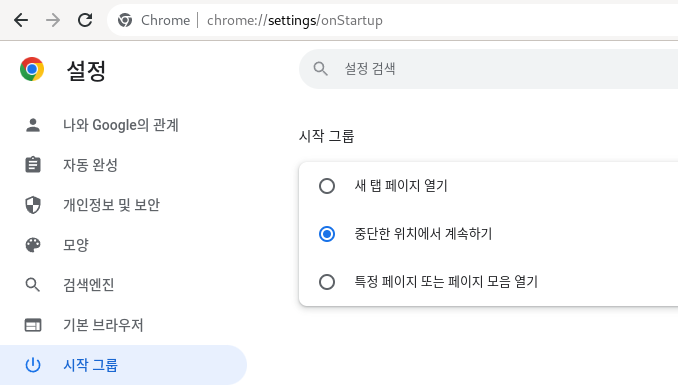크롬 재설정 후 복원하는 방법은 다음과 같다. 먼저 크롬 실행 후 설정에서 "중단한 위치에서 계속하기"를 다시 설정해주고 크롬을 끈다. 그 다음에 ${HOME}/.config/google-chrome/Default/Sessions 디렉터리로 이동해서 새로 생성된 Session이나 Tabs 파일을 모두 삭제한다. 마지막으로 압축해뒀던 Sessions_220725-231659.tar.gz 파일을 풀어주면 된다. 파일을 삭제하고 압축해제하는 과정을 순서대로 하면 다음과 같다.