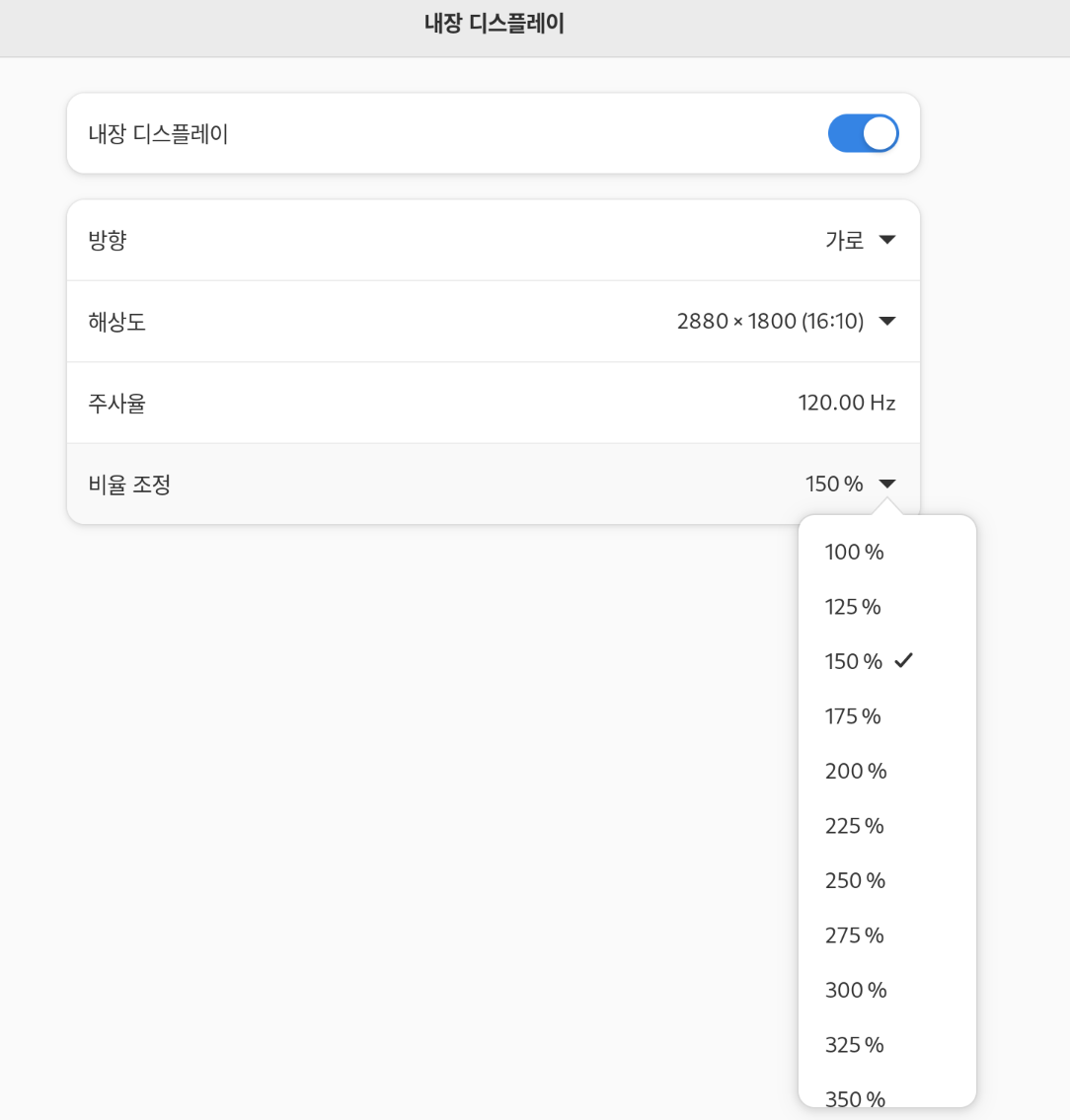 리눅스에서 가장 많이 사용되는 데스크탑 환경인 GNOME3에서는 화면 확대 스케일(screen scale)이 100% 단위로 변경할 수 있게 되어있다. 따라서 설정에 보면 100%, 200%, 300% 식으로 조정 된다. 하지만 요새 판매되는 14인치 노트북의 2880x1800에서는 200%는 너무 크고, 대략 150%나 175% 비율 확대를 사용 해야 편리하다.
