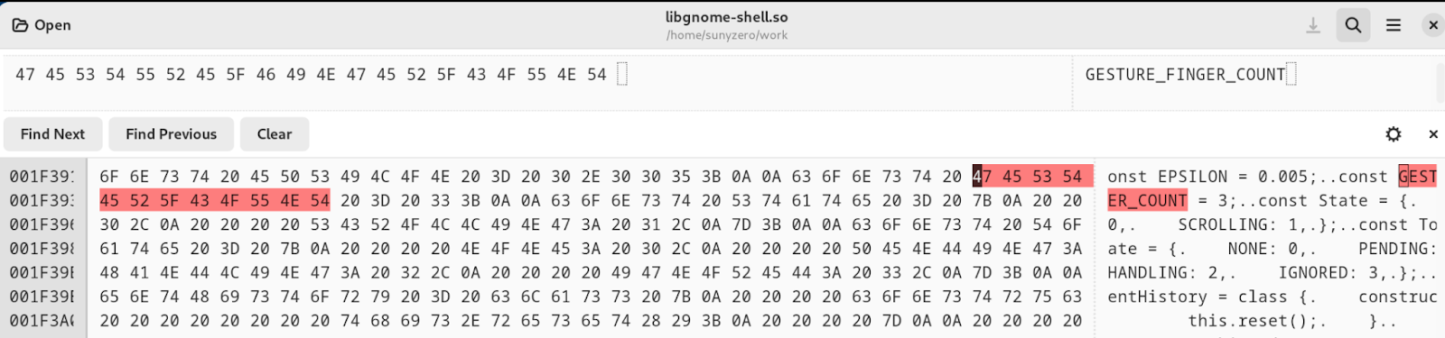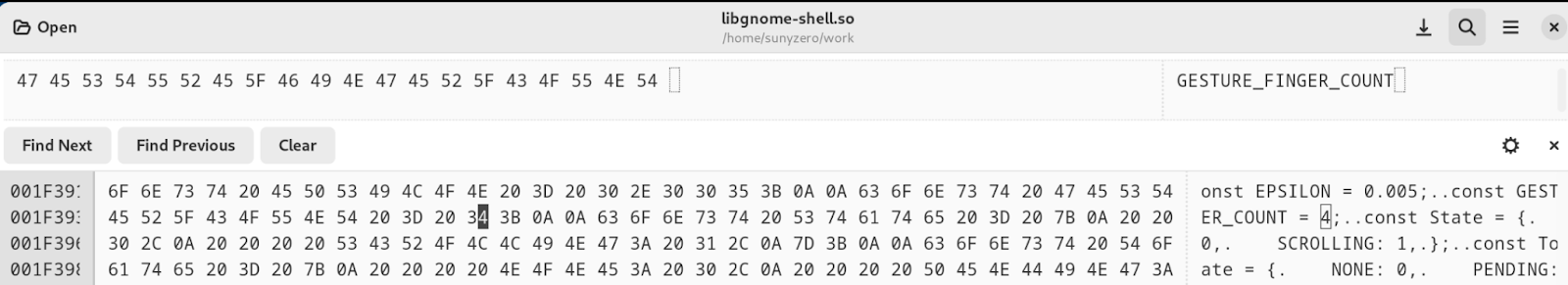 ghex libgnome-shell.so 명령으로 파일을 열고 const GESTURE_FINGER_COUNT 상수값 선언 부분을 찾는다. 아래는 ghex에서 찾은 이미지이다.