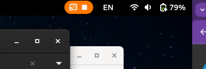 xdg-desktop-portal-gnome 기능을 공유하여 원격 조종 허용 상태가 되면 GNOME 데스크탑에서는 우측 상단 상태바에 아래 그림처럼 주황색의 마크가 나타난다. 주황색 마크의 네모난 모양의 STOP 버튼을 눌러서 즉시 원격 조종을 끌 수도 있다.