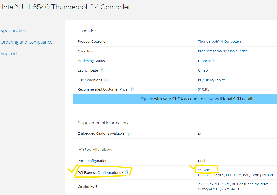 아래는 JHL8540 썬더볼트4 컨트롤러의 스펙이다. 여기 보면 PCI Express Configurations의 스펙이 x4 Gen3로 적혀있는 것을 볼 수 있다.