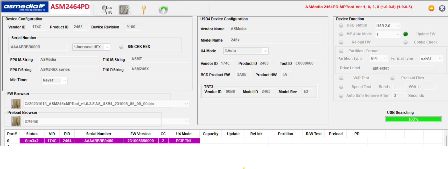 보통 NVMe 외장 케이스(enclosuer)의 속도는 USB3 계열로는 5Gbps, 10Gbps, 20Gbps 제품이 있고, TB3, TB4나 USB4의 40Gbps 제품이 있다. 보통 USB3 계열은 하위 호환이 잘되지만 썬더볼트는 USB와의 하위 호환은 별도의 칩셋으로 해결했었다. 주로 JMicron의 JMS582 칩셋을 추가로 사용했는데, Asmedia의 ASM2464PD 제품은 USB4 40Gbps 및 USB3.2의 20Gbps/10Gbps/5Gbps를 모두 지원하는 특징이 있다. 하나의 칩셋에 USB 40Gbps, 20Gbps, 10Gbps, 5Gbps의 기능을 다 넣었다고 보면 된다.