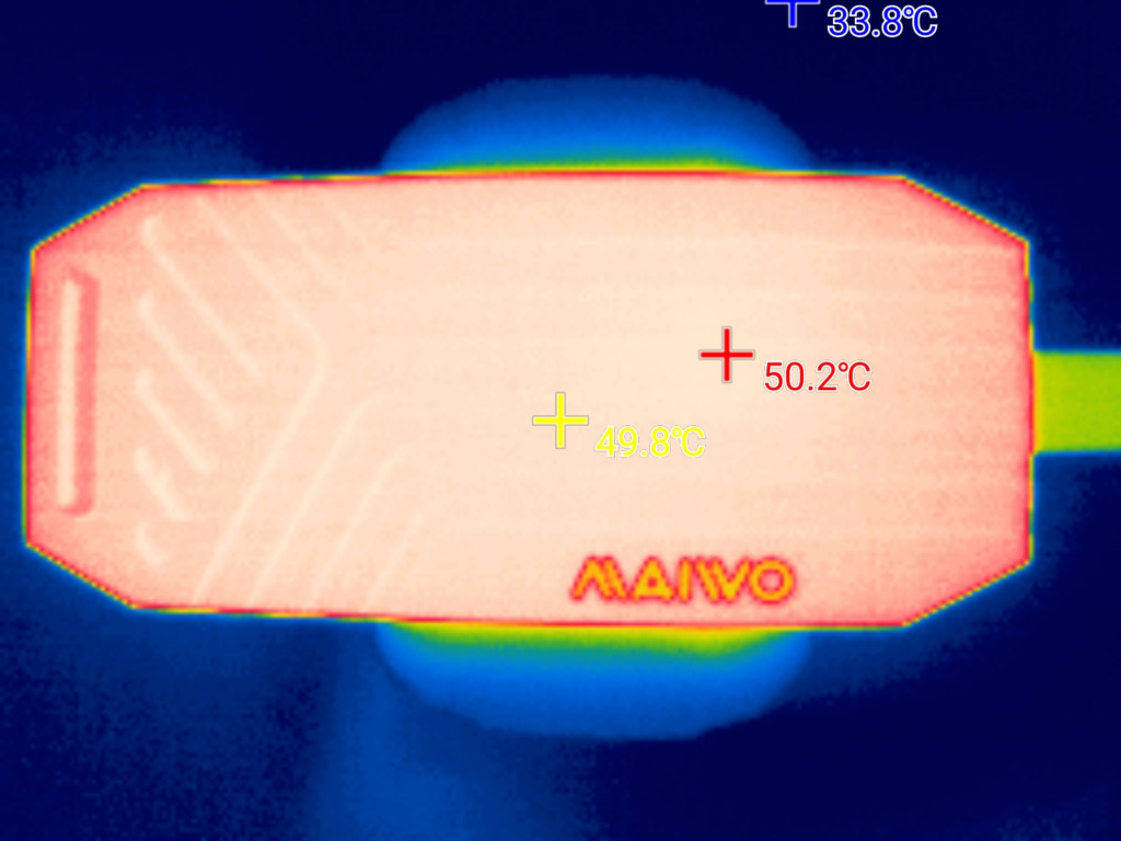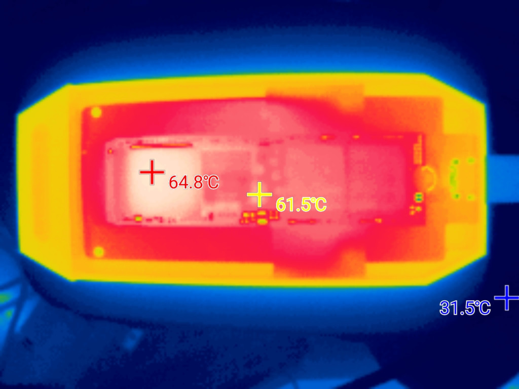 기본적으로 썬더볼트 외장 디스크는 발열이 꽤 높다. 평상시에도 섭씨 50도를 넘는다. 크리스탈 디스크 인포로 확인해보면 보통 55도 정도를 유지하고, 열화상 카메라로 찍어봐도 50도 정도로 보인다. 심지어 저 사진은 아무것도 안할 때 찍은 것이다. 실제로 벤치마크나 쓰기를 시작하면 55~58도 정도로 올라간다.