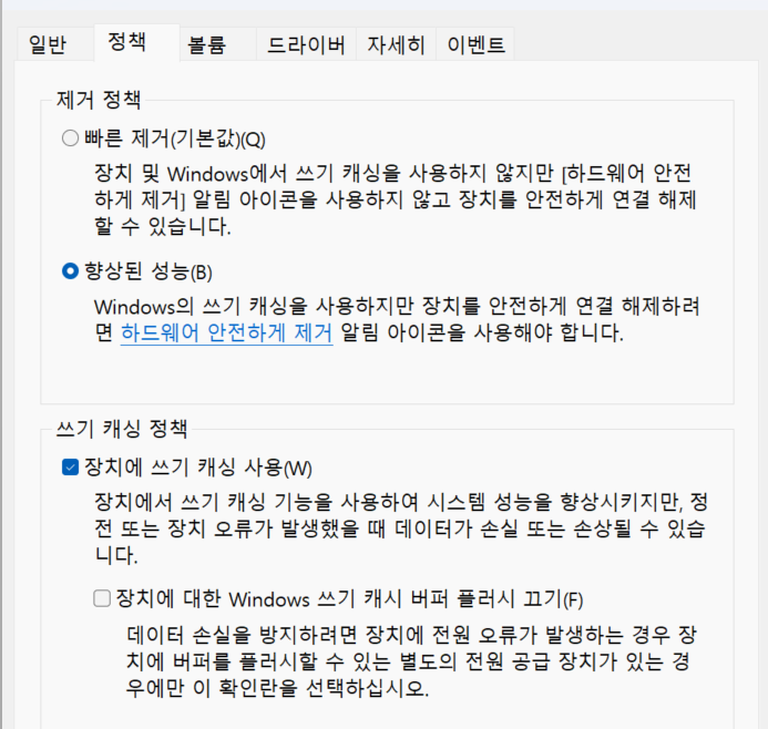 간혹 PC를 다른곳에 연결하면 속도가 떨어지는 경우도 있는데, 이건 윈도11에서 외장 디스크는 캐시를 쓰지 않도록 되어있어서 그렇다. 특히 썬더볼트나 USB4는 캐시 사용을 안하면 제대로 된 속도가 안나온다. 따라서 아래와 같이 캐시를 사용하도록 해주면 해결된다. (장치관리자에서 디스크 드라이브에서 해당 목록을 선택하면 된다.)