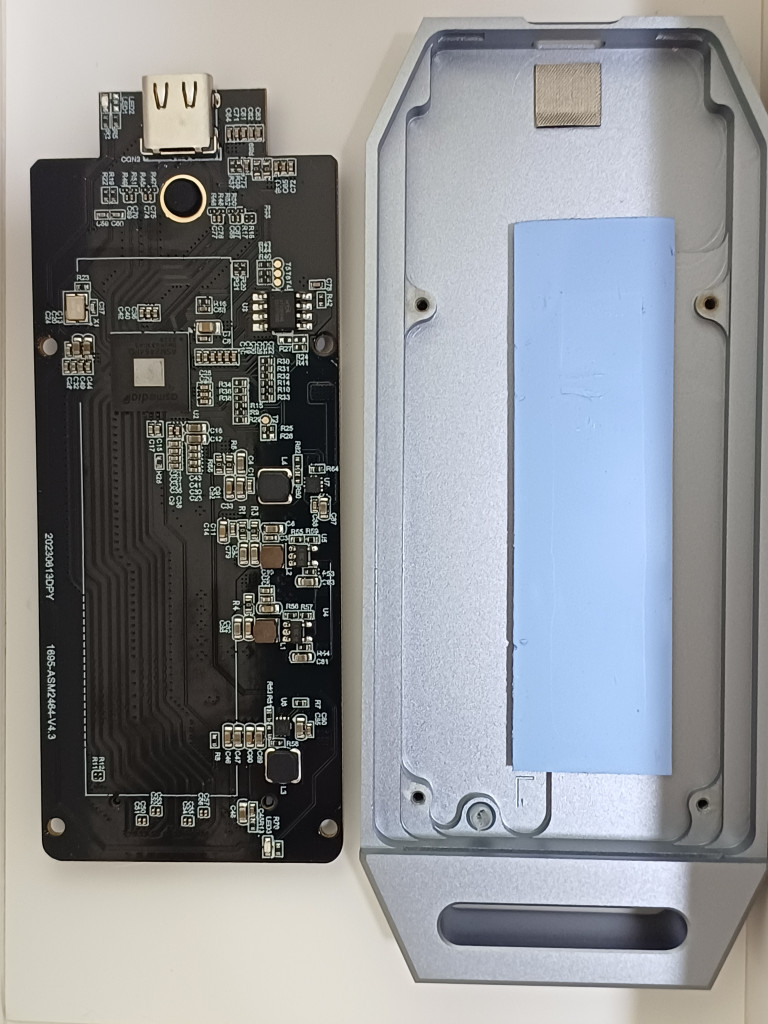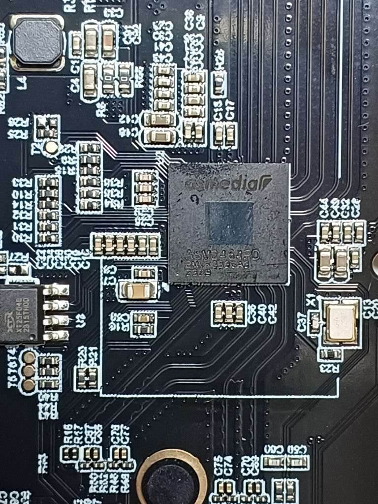 뒷면에는 각종 부속품들이 보이고, 위 그립 상단 왼쪽에 가장 큰 칩셋이 ASM2464PD 칩셋이다. 해당 칩셋을 약간 근접샷으로 찍어보면 정확하게 칩셋 이름이 보인다.