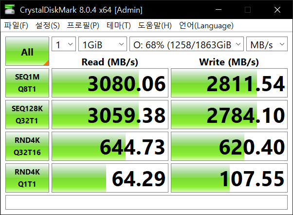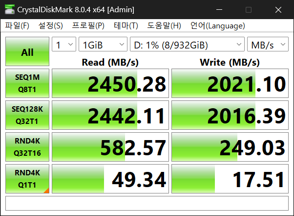 디램리스 제품인 SN550으로는 읽기 2450MB/s, 쓰기 2021MB/s 정도로 trim 후 몇번을 테스트를 해봐도 비슷한 수치가 나온다.