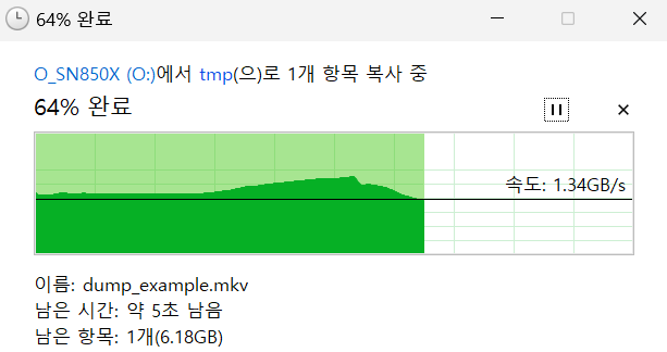 하지만 벤치마크와 달리 실제 사용시에는 위와 같은 속도는 나오지 않는다. 실제 탐색기에서 20GB 정도크기의 파일을 복사해보면 아래와 같은 속도가 나온다. (원본 파일은 SN850x로 PCIe 4에 장착된 SSD에 있었고, Maiwo k1625에는 PM9A1을 넣고 테스트했다.) 아래 캡쳐했을때는 캡쳐 프로그램이 작동하면서 잠깐 속도가 떨어진 상태이고, 실제로는 평균은 1.5~1.8GB/s이고, 최대로는 2.1GB/s 정도로 나왔다.