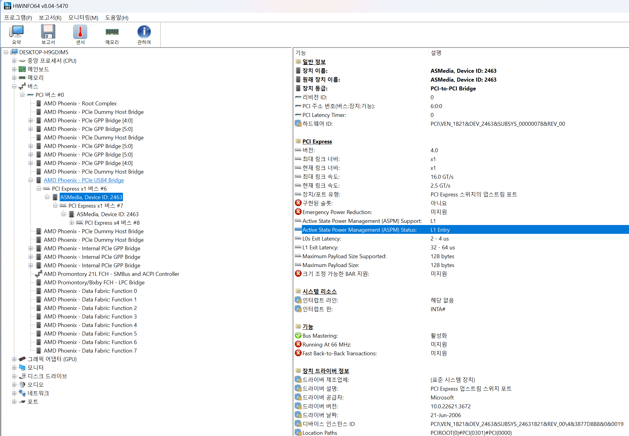 HWinfo 툴로 확인해보면 다음과 같이 보인다. 현재 상태는 ASPM을 켜놓아서 L1 entry가 활성화 되어있음을 볼 수 있다. (버스의 PCI 버스 번호를 잘 모르면 그냥 마우스 오른버튼 팝업에서 모두 펼치기로 보면 쉽게 찾을 수 있다)