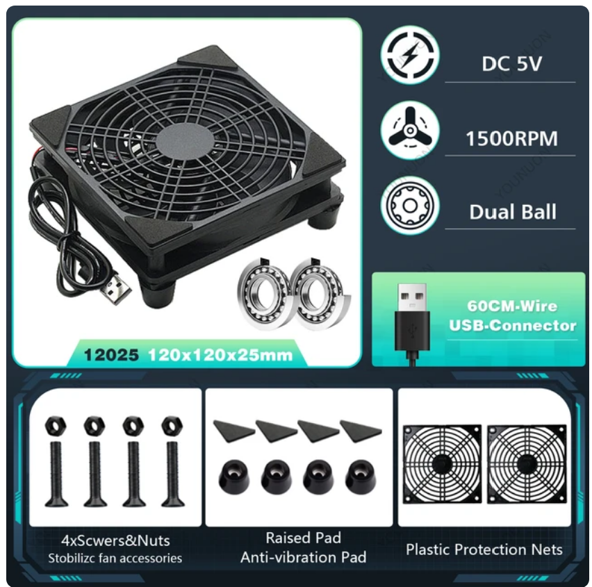 따라서 가장 큰 약점은 발열이다. 발열이 심해도 너무 심한데, 위에 본 것처럼 컨트롤러 칩셋은 아무것도 안해도 80도 가까운 온도를 보여준다. 한번에 100기가가 넘는 파일을 옮겨보면 더 심하게 온도가 발생해서 외부 온도도 60도를 넘어서 손으로 잡기 힘들 정도였다. 나중에 보니까 Maiwo k1625에 팬이 달린 모델이 나왔는데, 쓰기를 많이 한다면 진짜 팬이 있는 모델을 써야 할 것 같다. 썬더볼트 외장을 구매한다면 팬 달린 제품을 권장하는데, 이게 또 소음이 있을 수 있다는 단점이 있다. 아니면 아래 사진처럼 알리에서 파는 공유기용 USB 팬을 구입해서 그 위에 두는 것도 괜찮을 것이다.(과거 ASUS 공유기가 발열로 죽는 경우가 있어서 사둔 팬에 올려두니 너무 잘 작동하였다. 보통 알리에서 라우터쿨러로 검색하면 된다.)
