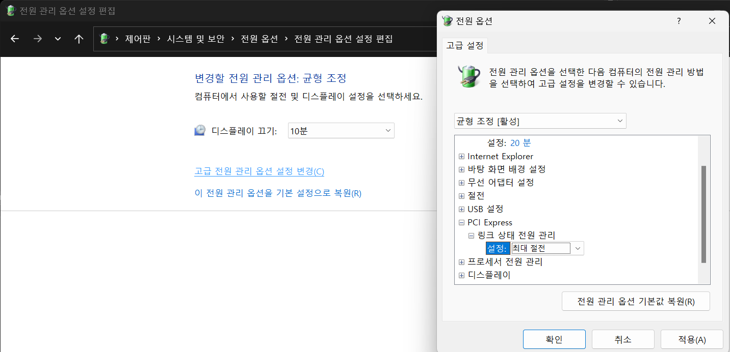 어떤 분은 PCIe의 절전 기능인 ASPM(Active State Power Management)를 켜면 발열이 줄어든다고 했다. 그래서 BIOS에서 해당 기능을 찾아서 켜주고, 윈도우 제어판에서 PCIe 절전 기능을 켰다.
