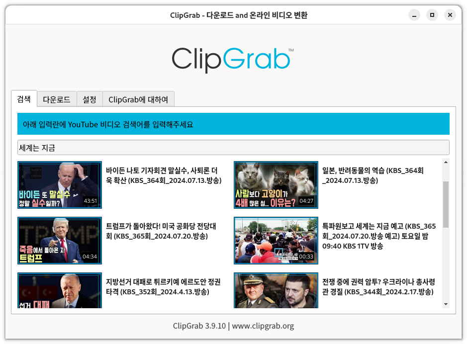 개인적으로 Clipgrab의 속도가 빨라서 종종 사용하는 편이다. 참고로 ClipGrab은 윈도10, 윈도11, Mac도 지원한다. 설치는 검색해보면 공식 다운로드 링크를 볼 수 있을 것이다. (이상한 곳에서 다운로드 받으면 바이러스에 걸리므로 항상 오피셜 사이트인지 확인하고 받자. 이왕이면 좋은 프로그램을 만든 저작자에게 도네이션하면 좋을 듯 싶다.)