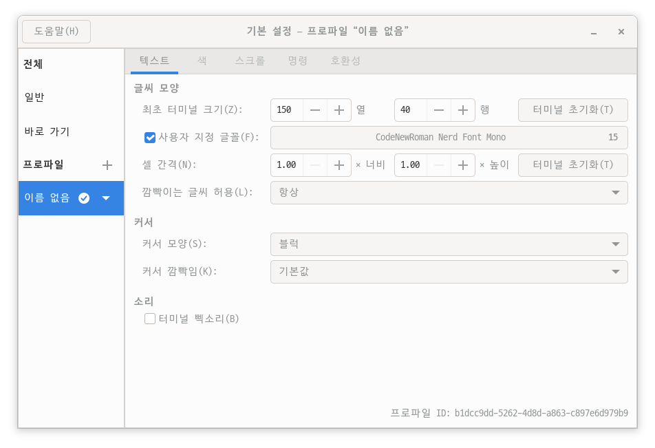 CodeNewRoman은 터미널인 gnome-terminal에서 설정해도 좋은 글꼴이다. 아래 그림은 gnome-terminal에 설정한 모습이다.