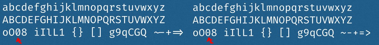 첫번째로 숫자 0 (zero)의 안쪽이 빗금인지 점인지를 확인한다. 개인적으로 빗금 스타일을 더 선호한다. 아래 그림을 보면 좌측은 빗금 스타일 0(slashed zero number)을 사용하고, 우측은 점을 찍은 것이다. 어느 스타일을 선호하는지 본인이 여기서 보고 정하면 된다.