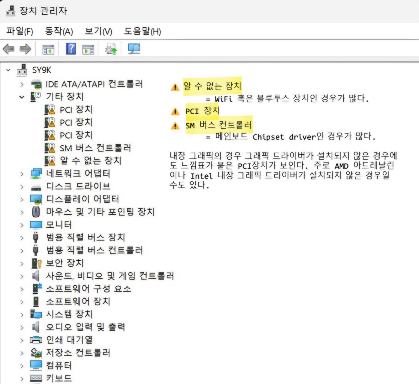 윈도10이나 윈도11의 장치관리자에 느낌표가 생기는 경우가 있다. 특히 새로운 컴퓨터를 조립해서 갓 윈도를 설치했을때나 부품을 교체했을때 종종 발생한다. 이런 경우에 장치관리자에는 PCI 장치, SM 버스 컨트롤러, 알 수 없는 장치라고 표시되는데, 원인은 드라이버를 제대로 설치하지 않아서 발생된다.