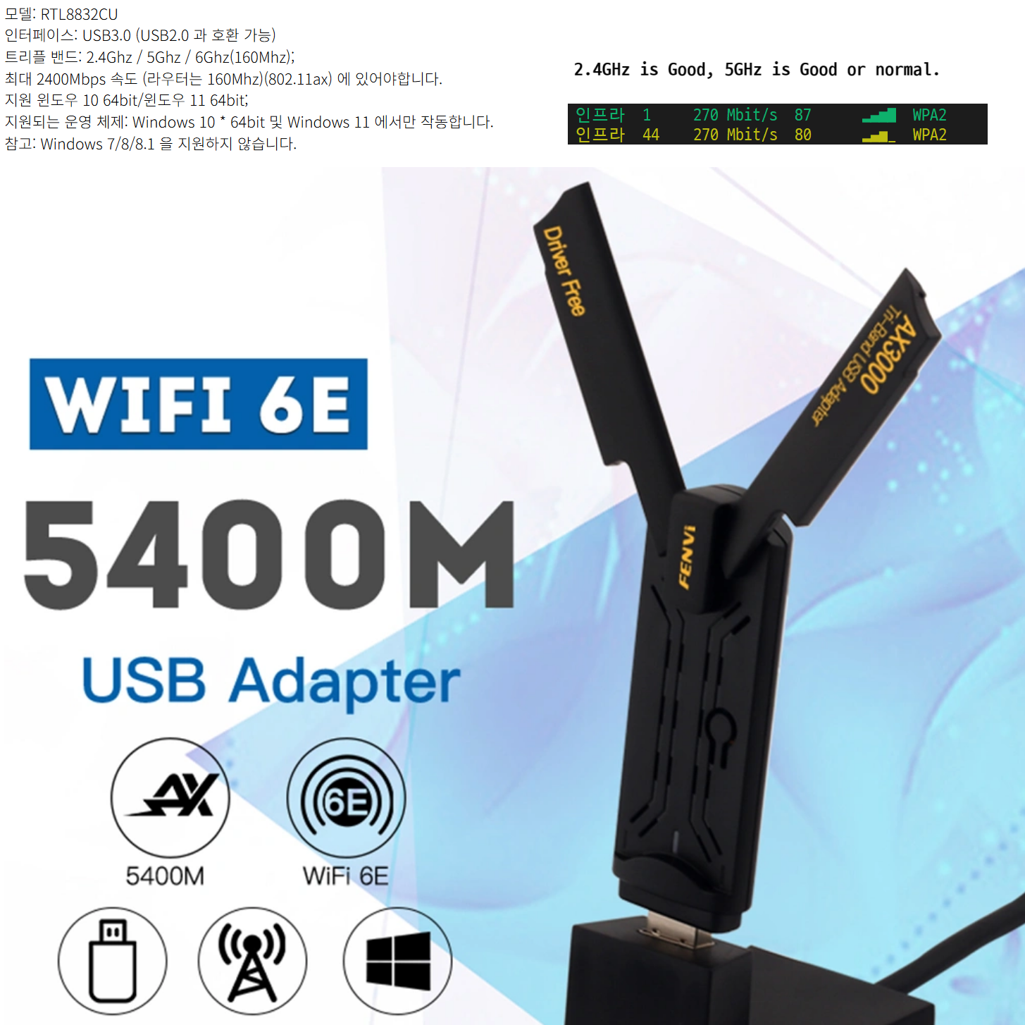 WIFI6e 제품도 있길래 하나 사서 별도로 테스트해봤는데, 그냥 soso했다. 속도는 잘 나오는 편이었다. 칩셋은 RTL8832CU를 사용했으며, 이 제품도 연결하면 USB 외장 디스크가 있고 그 안에 드라이버 설치 파일이 있었다.