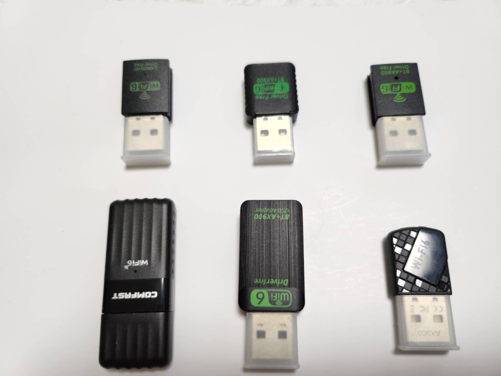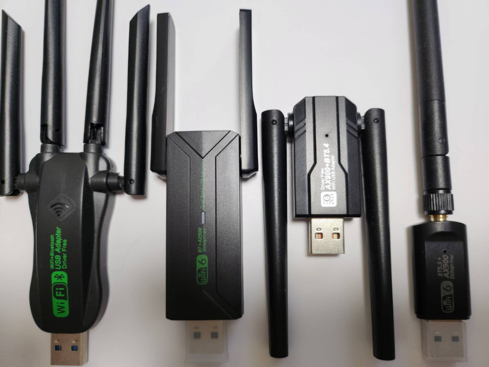 알리익스프레스에서 구입해서 테스트한 AX900 제품은 총 10종류로 아래 사진과 같다. 내장 안테나 버전이 6개, 외장 안테나 버전이 4개이다. 상식적으로 외장 안테나가 달린 동글의 성능이더 좋을거라고 생각했는데, 테스트 결과는 의외로 외장 안테나가 있다고 성능이 더 좋은건 아니였다.
