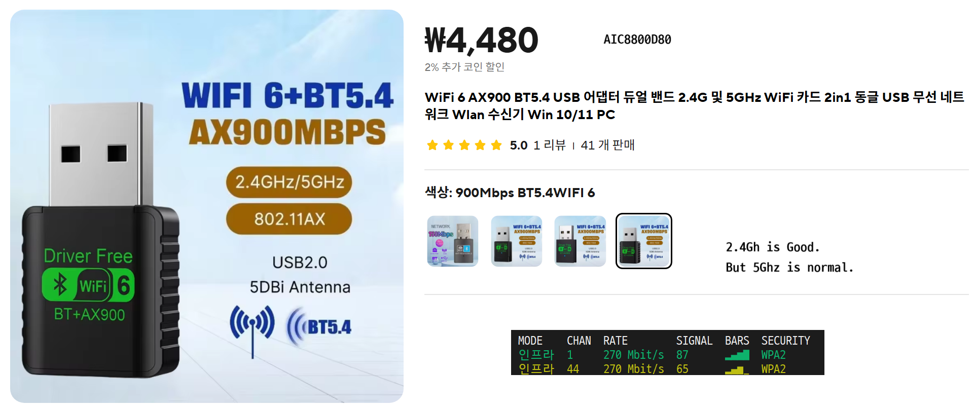 이 제품은 Realtek RTL8831BU 칩셋을 사용했으며, 외장 안테나는 1개이다. 나사 방식이라 안테나는 분리가 가능하다. 이 제품도 USB연결시 외장 디스크가 인식되고 그 안에 드라이버가 들어있다. 블루투스 지원은 5.3 버전이고, 리눅스에서 지원은 github에서 받아서 빌드하면 된다. 특징으로는 wifi 동작 방식이 infra와 adhoc 둘다 가능하다는 점이다. 신호 강도고 괜찮고 꽤 쓸만했다.