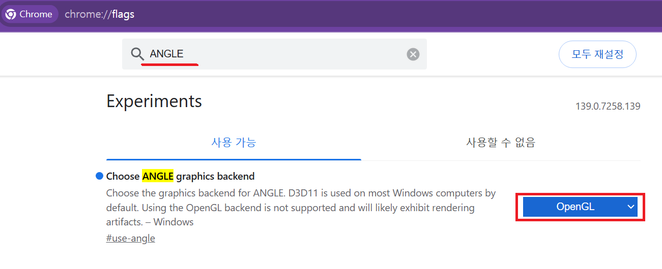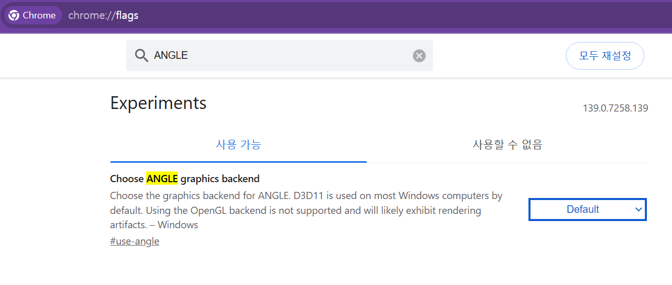이렇게 하면 이제 크롬 화면이 보일 것이다. 임시로 띄운 것이므로 여기서 설정을 손봐야 한다. 먼저 주소창에서 chrome://flags를 실행한다. 그리고 주소창 아래의 돋보기 검색창에 ANGLE을 타이핑하면 Choose ANGLE graphics backend가 보일 것이다. 이 값이 Default가 아닌 OpenGL 같은 다른 값으로 되어있을 것이다.