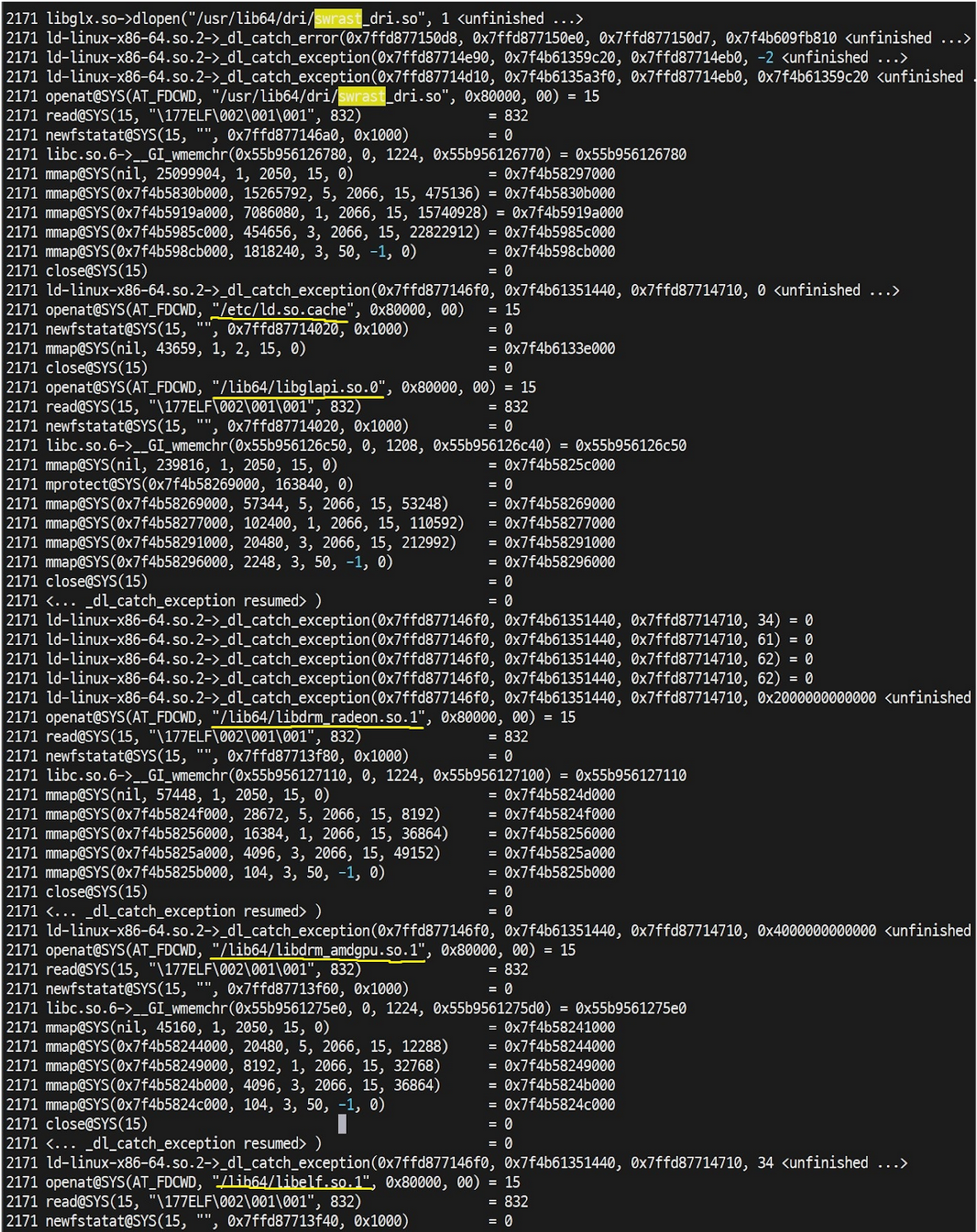 위 그림에서 openat@SYS을 살펴보면 각각 오픈하는 so(shared object) 파일들이 libglapi.so libdrm_radeon.so, libdrm_amdgpu.so, libelf.so등으로 보인다. 여기서 libelf.so는 시스템에서 기본으로 사용하는 shared object이므로 범인이 아니다. 참고로 2171 openat@SYS(AT_FDCWD, "/lib64/libdrm_amdgpu.so.1"을 오픈하는 것을 볼 수 있는데, 직후 _dl_catch_exception 익셉션은 그냥 발생하는 것이므로 에러가 아니다. 그러면 이제 원인이 된 라이브러리 목록을 알았으니 하나하나 찾아가면 된다.