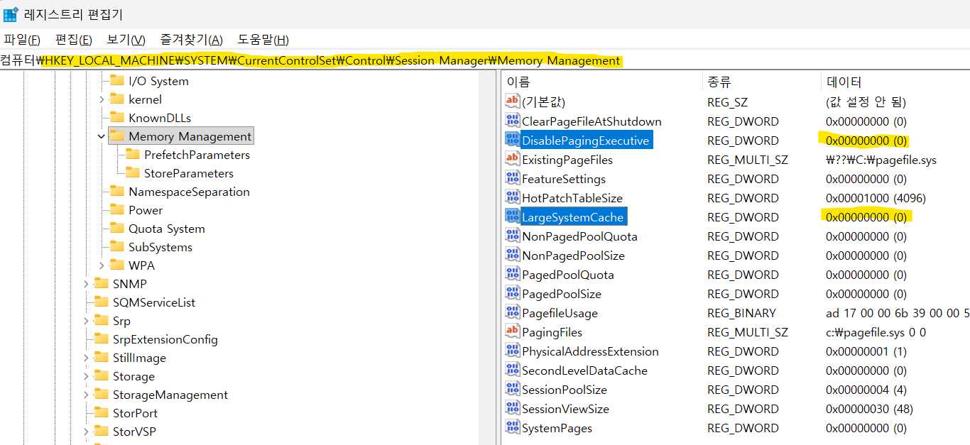 여기서 HKEY_LOCAL_MACHINE\SYSTEM\CurrentControlSet\Control\Session Manager\Memory Management 설정으로 이동하면 LargeSystemCache나 DisablePagingExecutive 설정이 보일 것이다. 이 값들은 on하는 것이 1이고, off하는 것이 0이다. 당연히 default값은 off인 0이다. 이 2가지 설정 값이 1이라면 0으로 수정하면 된다.